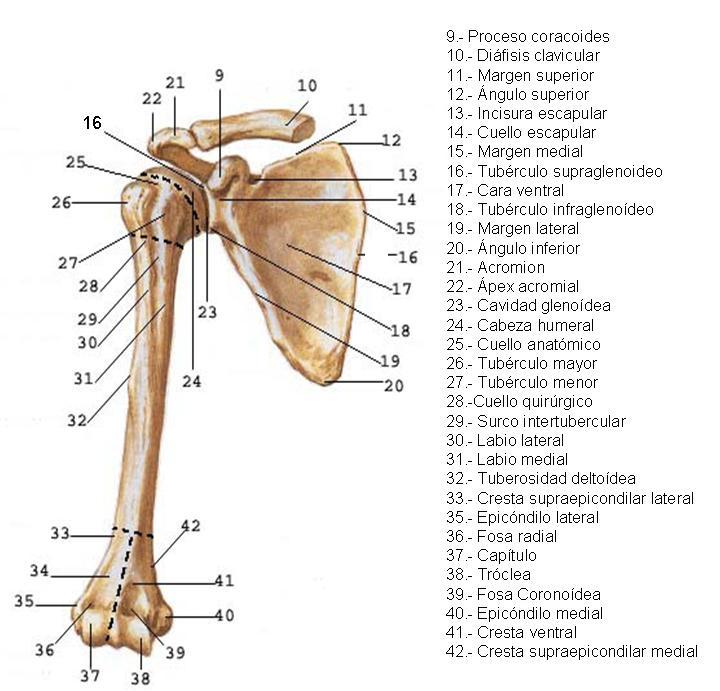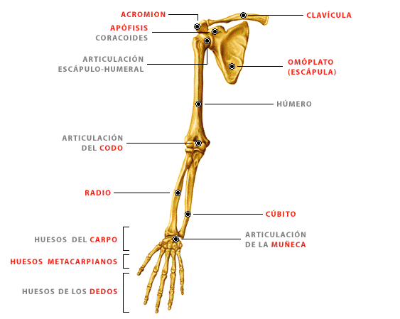 Huesos de cada región:- Hombro: Clavícula y escápula- Brazo: Húmero- Antebrazo: Radio y cubito- Mano: Huesos del carpo, metacarpo y falanges