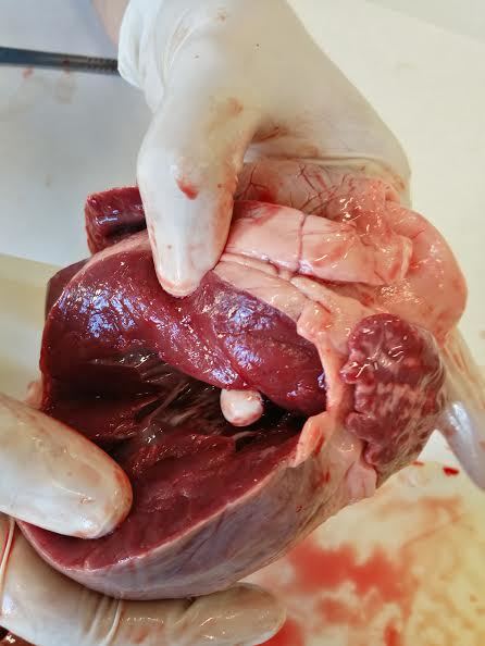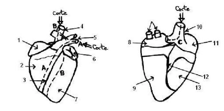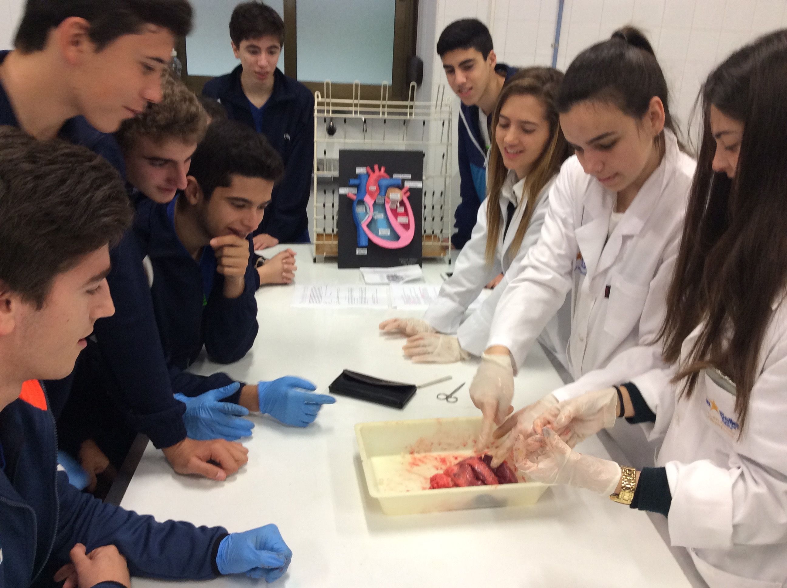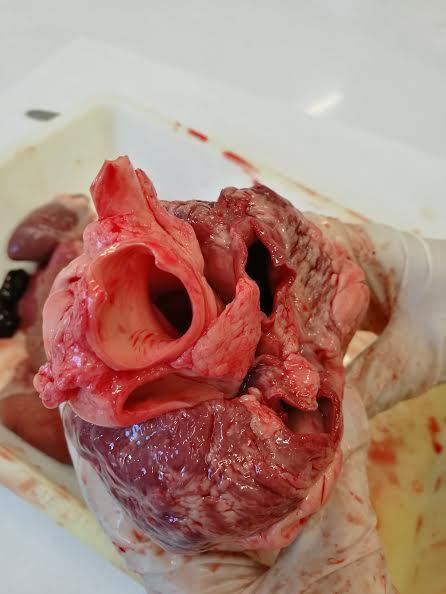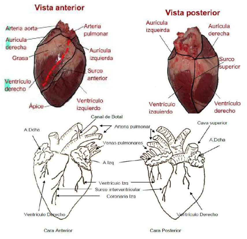 El aparato circulatorio es la estructura anatómica compuesta por el sistema cardiovascular, que conduce y hace circular la sangre, y por el sistema linfático, que conduce la linfa unidireccionalmente hacia el corazón. En el ser humano, el sistema cardiovascular está formado por el corazón, los vasos sanguíneos (arterias, venas y capilares) y la sangre, y el sistema linfático está compuesto por los vasos linfáticos, los ganglios, los órganos linfáticos (el bazo y el timo), la médula ósea y los tejidos linfáticos (la amígdala, las placas dePeyer…) y la linfa. El corazón humano un órgano musculoso y cónico situado en la cavidad torácica.Funciona como una bomba, impulsando la sangre por el interior de los vasos sanguíneos a todo el cuerpo. Su tamaño es un poco mayor que el puño de su portador. Es un órgano hueco dividido longitudinalmente en dos mitades independientes e incomunicadas. Cada una de ellas posee dos compartimentos, cámaras o cavidades: una superior (aurícula) y otra inferior (ventrículo), que se comunican por una válvula aurículoventricular.Procedimiento1. El corazón suele venir acompañado de restos de su membrana envolvente, el pericardio. 2. Lavamos el corazón con abundante agua.3. Con el bisturí removemos los residuos de grasa.4. Limpiamos con los dedos la grasa acumulada en las salidas de los grandes vasos.ESTUDIO DE LA ANATÓMÍA EXTERNA5. Introducimos el corazón en la cubeta de disección y vemos que está recubierto por el pericardio, con unacapa de grasa patente sobre las coronarias, lo que delimita la posición de ventrículos y de aurículas.6. Distinguimos el lado izquierdo del derecho porque es el más voluminoso. 7. Observamos detenidamente tratando de reconocer la aurícula derecha y la izquierda. La parte más voluminosa e importante del corazón la constituyen los ventrículos. Las aurículas son mucho menores y de musculatura menos potente que la de los ventrículos.8. Colocamos el corazón con la cara anterior o ventral, más abombada,hacia arriba y observamos que acaba en punta.9. Le damos la vuelta para ver la cara posterior o dorsal, que es plana.10. Las arterias, de color blanquecino, permanecen abiertas porque sus paredes son más gruesas, elásticas y firmes. Las venas tienen forma de tubos aplastados. Introducimos un dedo en ellas para descubrir a qué cavidad cardíaca con la que se comunican.11. Conectamos un tubo de goma al grifo e introducimos el otro extremo por la vena cava primero y por la vena pulmonar después. ¿Por dónde sale el agua?12. Introducimos a continuación el tubo de goma por las arterias. ¿Qué ocurre? ¿Por qué?13. En la cara anterior, entre el ventrículo izquierdo y el derecho, hay un ligero surco oblicuo, con depósitos de grasa, arterias y venas coronarias, es elsurco anterior, que es la manifestación externa del tabique interventricular .14. Entre la base de inserción de las aurículas y los ventrículos, está el surcoauriculo-ventricular, que se corresponde con el límite interno del corazón entre aurículas y ventrículos, por el que corren arterias y venas coronarias.15. En la cara posterior, entre los ventrículos, está, en dirección casi vertical, el surco posterior o superior, por el que corren arterias y venas coronarias que riegan las paredes (miocardio, músculo encargado de bombear la sangre por el sistema circulatorio mediante contracción.) El miocardio contiene una red abundante de capilares indispensables para cubrir sus necesidades energéticas. El músculo cardíaco generalmente funciona involuntariamente, sin tener estimulación nerviosa. Es un músculo miogénico, es decir autoexcitable.DISECCIÓN Y ESTUDIO DE LA ANATOMÍA INTERNA16. Colocamos el corazón sobre la cara plana (posterior o dorsal), con la cara anterior o ventral, abombada, hacia arriba. 17. Introducimos el bisturí/la aguja enmangada por la arteria pulmonar para que luego nos sirva de guía por donde cortar con las tijeras.En la base de la arteria pulmonar hay tres repliegues membranosos, las válvulas sigmoideas o semilunares de la arteria18. Con las tijeras, abrimos el ventrículo derecho, (línea A), siguiendo el recorrido del bisturí/la aguja enmangada/ (introducido anteriormente por la arteria pulmonar), a 0,5 cm por encima del surco interventricular. En el interior del ventrículo, hay otros tres repliegues membranosos y fuertes, laválvula tricúspide de color blanquecino y aspecto filamentoso.19. Introducimos el bisturí/la aguja enmangada/ por la aorta para que después nos sirva de guía por donde cortar con las tijeras. En la base de la aorta hay tres repliegues membranosos, las válvulas sigmoideas o semilunares (que impiden en retroceso de la sangre hacia el ventrículo), y encima de ellas el orificio de arranque de las dos arterias coronarias que riegan el corazón20. Con las tijeras abrimos el ventrículo izquierdo,(línea B), siguiendo el recorrido del bisturí a 0,5 cm por debajo del surco interventricular. Lasparedes exteriores del ventrículo izquierdo son mucho más gruesas (el triple) que las del ventrículo derecho, para poder bombear sangre oxigenada a través de la arteria aorta hacia el cuerpo21. En el interior del ventrículo hay dos repliegues membranosos y fuertes, la válvula mitral (que impide el retroceso de la sangre hacia la aurícula cuando se contrae el ventrículo). Las dos hojas de la válvula se fijan por las fibras tendinosas de los músculos papilares a las paredes del ventrículo.22. Le damos la vuelta al corazón.23. Introducimosel bisturí/la aguja enmangada/ por la vena cava superior para que después nos sirva de guía por donde cortar.24. Con las tijeras abrimos la aurícula derecha, siguiendo el recorrido del bisturí/ anteriormente introducido por la vena cava superior (línea C). Observamos que sus paredes son rugosas (a diferencia de la izquierda que tiene paredes lisas).