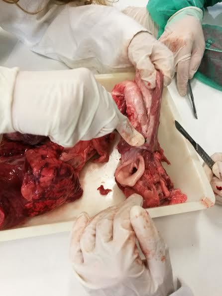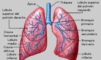 Los pulmones son los órganos en los cuales la sangre recibe oxígeno desde el aire y a su vez la sangre se desprende de dióxido de carbono el cual pasa al aire. Este intercambio, se produce mediante la difusión del oxígeno y el dióxido de carbono entre la sangre y los alvéolos que forman los pulmones sus dimensiones varían, el pulmón derecho es algo más grande que su homólogo izquierdo, poseen tres caras; mediastínica, costal y diafragmática, lo irrigan las arterias bronquiales, y las arterias pulmonares le llevan sangre para su oxidación.PROCEDIMIENTOPrimero nos fijaremos en la anatomía general del aparato respiratorio (zona interna) y la disposición del corazón entre los pulmones. Con ayuda del bisturí, se procederá al corte y separación del armazón cartilaginoso de arriba del tubo, la laringe. Podremos observar un tubo cartilaginoso, la tráquea, con sus anillos semicirculares en U que mantienen el tubo siempre abierto. El tramo final de la tráquea se bifurca en dos, los bronquios que se internan en los pulmones. Con la ayuda de una cánula, por el interior de la tráquea, se sopla para poder evidenciarse el aumento de volumen pulmonar (2‐3 veces superior al normal). Se toma el pulmón derecho (trilobulado) y se notará el tacto esponjoso así como el brillo que proporcionan las finas membranas que lo recubre, denominadas pleuras, que caracterizan a este órgano aislado de la caja torácica para favorecer su movimiento durante la respiración. Continuamos con la disección por el bronquio hasta que aparezcan nuevos tubos de diámetro menor: los bronquios secundarios que acaban en otros más finos aún: los bronquiolos. Si continuamos con la disección se observará la emanación de sangre; consecuencia esta última de la rotura de los capilares sanguíneos que tapizan la superficie de los alvéolos