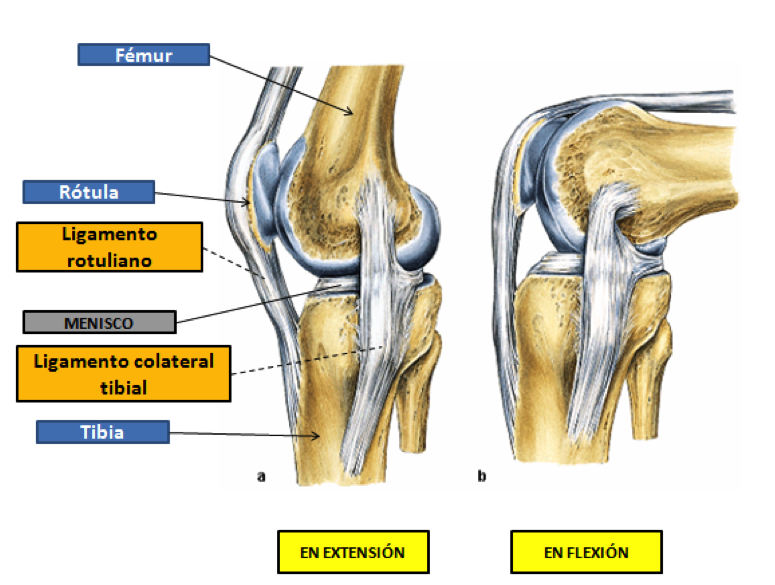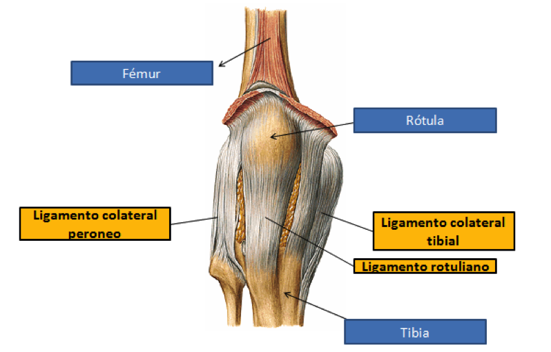 La articulación de la rodilla está asegurada por muchas estructuras ligamentosas (ligamento: tejido conjuntivo que une los huesos entre sí). La función de estos ligamentos es impedir que los huesos que forman la articulación se rocen entre sí con fuerza durante los movimientos y mantienen la estructura. En una visión exterior de la rodilla se pueden observar 3 ligamentos principales: ligamento rotuliano, ligamento colateral peroneo y ligamento colateral tibial.