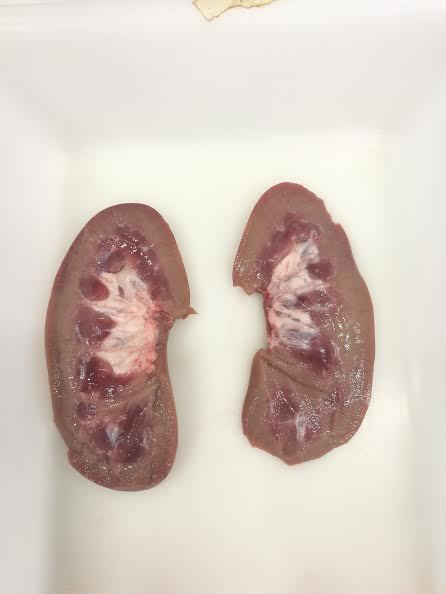 La excreción es la eliminación de los productos de desecho y la encargada de mantener constante la cantidad de agua y sales minerales de nuestro organismo.En la práctica estudiaremos la anatomía de un riñón, que es el órgano mas importante encargado de esta función. El resultado de la excreción renal es la formación de la orina,en las nefronas,a partir del plasma sanguíneo.También veremos las distintas partes del riñón, como la corteza, médula y pelvis, asociándolos con la filtración del plasma sanguíneo y la reabsorción de agua y otras moléculas útiles.PROCEDIMIENTO: Coloca el riñón en la plancha de disección y observa su anatomía externa. Identifica, dibuja y describe su forma, coloración, orificios de la arteria renal, vena renal y uréter. Mide el riñón en sus tres dimensiones y pésalo en la balanza. Anota los resultados obtenidos. Secciona longitudinalmente el riñón con el bisturí procurando hacer un corte limpio y continuo para no dañar su estructura interna. Extiende ambas partes sobre la cubeta de disección y fíjate en su anatomía interna. Puedes utilizar la lupa para obsevar con más detalle la estructura interna. Identifica la cápsula (algunas veces no está presente ya que la suelen quitar en la carnicería), la corteza, la zona medular y la pelvis renal. Anota en tu cuaderno el color, aspecto, forma y textura de cada una de las partes. Con una pipeta o cuentagotas extiende sobre una superficie recién cortada el riñón una pequeña cantidad de agua oxigenada. Observa si se produce efervescencia. Al cabo de unos segundos pasa el dedo por la superficie para eliminar el agua oxigenada y observa los túbulos colectores y las nefronas, donde continúa la formación de burbujas (Únicamente si el órgano es muy fresco). Anota tus observaciones. Deposita sobre un portaobjetos una pequeña muestra de la región Cortical y disemínala con la ayuda de la aguja enmangada. Añade una gota de agua y coloca encima un cubreobjetos y sobre éste una tira de papel de filtro doblado varias veces. Aprieta la preparación con el dedo pulgar de forma progresiva y sin hacer movimientos laterales, para lograr una mayor disgregación de la muestra sin que se deterioren las estructuras. Observa la preparación al microscopio, fíjate si hay estructuras globosas.