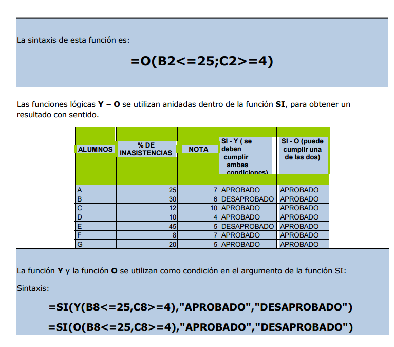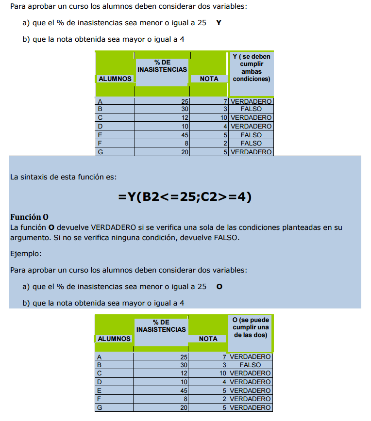 Función Y La función Y devuelve VERDADERO si se verifican todas las condiciones planteadas en su argumento. Si se verifica una sola de las condiciones o ninguna, devuelve FALSO. Las funciones lógicas Y – O se utilizan anidadas dentro de la función SI, para obtener un resultado con sentido.