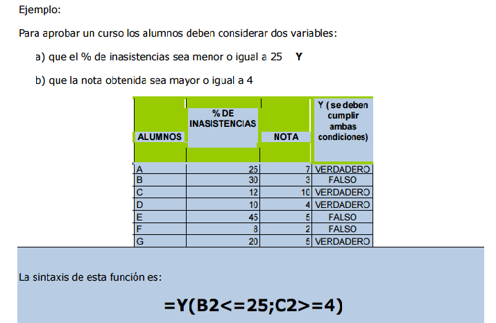 Función Y:Esta función devuelve VERDADERO si se verifican todas las condiciones planteadas en su argumento. Si se verifican una sola de las condiciones, o bien, ninguna, devuelve FALSO.