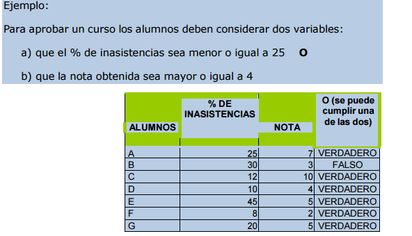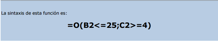 Función O:Esta función devuelve VERDADERO si se verifica una sola de las condiciones planteadas en su argumento. De lo contrario, si no se verifica ninguna condición, devuelve FALSO.