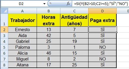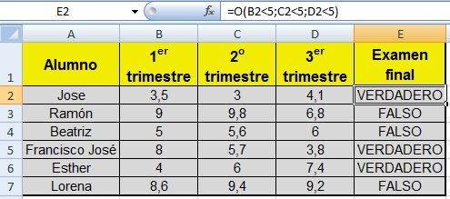 Función Y La función Y devuelve VERDADERO si se verifican todas las condiciones planteadas en su argumento. Si se verifica una sola de las condiciones o ninguna, devuelve FALSO. Ejemplo: Para aprobar un curso los alumnos deben considerar dos variables: a) que el % de inasistencias sea menor o igual a 25 Y b) que la nota obtenida sea mayor o igual a 4 Y.La sintaxis de esta función es: =Y(B2<=25;C2>=4) Función O La función O devuelve VERDADERO si se verifica una sola de las condiciones planteadas en su argumento. Si no se verifica ninguna condición, devuelve FALSO. Ejemplo: Para aprobar un curso los alumnos deben considerar dos variables: a) que el % de inasistencias sea menor o igual a 25 O b) que la nota obtenida sea mayor o igual a 4.La sintaxis de esta función es: =O(B2<=25;C2>=4)