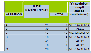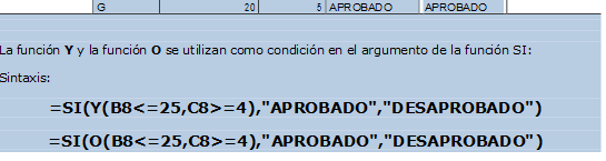 Funcion Y/OLa funcion Y devuelve VERDADERO si se veifican todas las condiciones planteadas en su argumento. Si se verifica una sola de las condiciones o ninguna, devuelve FALSO.=Y(B2<=25;C2>=4)=O(B2<=25;C2>=4)