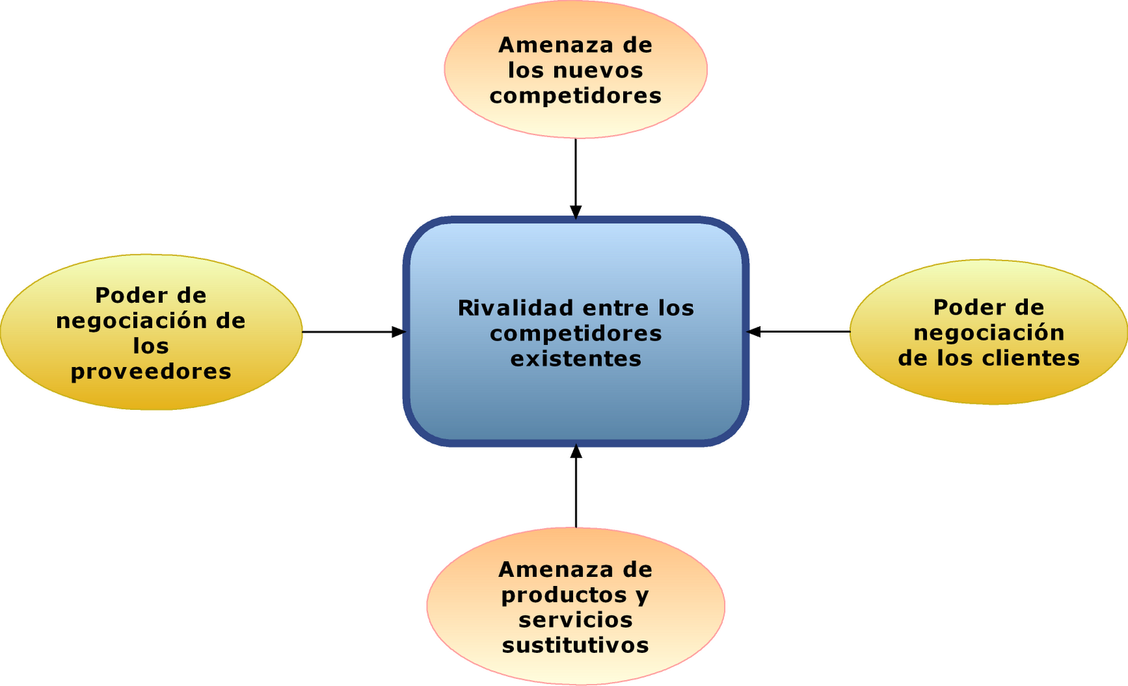 Cinco fuerzas competitivas básicas:1) Amenaza de entrada de nuevos competidores: Un nuevo competidor, trae nuevas capacidades, desea participación en el mercado y algunos recursos más. Sin embargo, una nueva empresa competidora enfrenta ciertas dificultades, como pueden ser: Economía de escala, Diferenciación del producto/lealtad a las marcas, Inversión de capital, Acceso a los canales de distribución, Política del gobierno.2) La rivalidad entre los competidores. Para un corporación será más difícil competir en un mercado donde los competidores estén muy bien posicionados pues constantemente estará enfrentada a guerras de precios, campañas publicitarias agresivas, promociones y entrada de nuevos productos.3) Poder de negociación de los proveedores. Un mercado no será atractivo cuando los proveedores estén muy bien organizados, tengan fuertes recursos y puedan imponer sus condiciones de precio y tamaño del pedido. 4) Poder de negociación de los compradores. A mayor organización de los compradores mayores serán sus exigencias en materia de reducción de precios, de mayor calidad y servicios y por consiguiente la corporación tendrá una disminución en los márgenes de utilidad. 5) Amenaza de ingreso de productos sustitutos. Un mercado no es atractivo si existen productos sustitutos reales o potenciales. La situación se complica si los sustitutos están más avanzados tecnológicamente o pueden entrar a precios más bajos reduciendo los márgenes de utilidad de la corporación y de la industria.