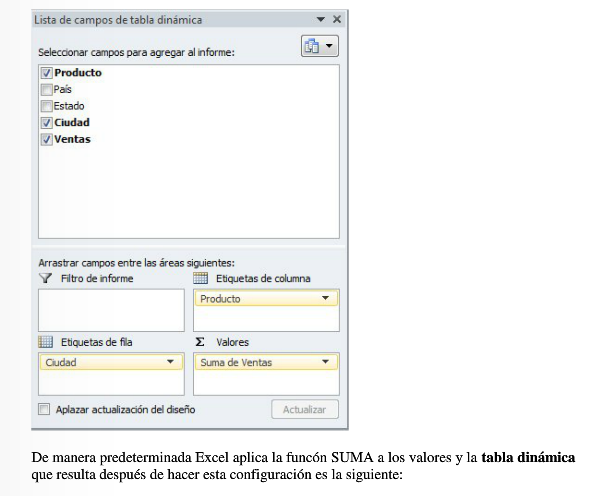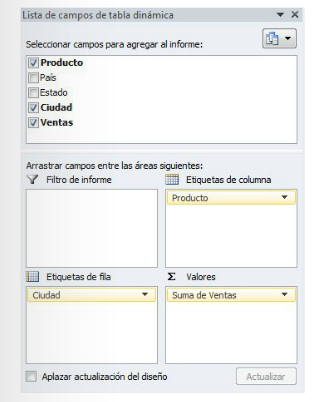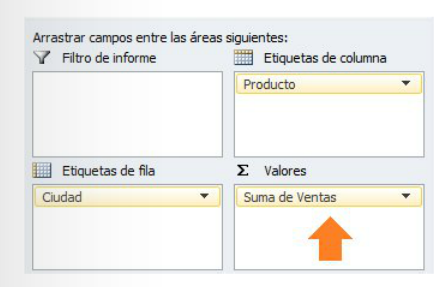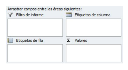 Filtro de informes:campos que coloques en esta área crearan filtro filtros para la tabla dinámica.Etiquetas de columna: esta área contiene los campos que se mostraran como columnas de la tabla dinámica.Etiquetas de fila: Contiene los campos que se mostraran como columnas de la tablan dinámica.Valores: son los campos que determinan las "celdas" de la tabla dinámica que serán utilizado.Una vez especificados los campos para casa una de las áreas, la tabla dinámica cobra vida.