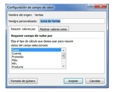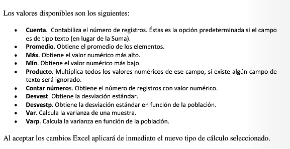 La función SUMA al momento de crear los totales y subtotales de los valores de una tabla dinámica sin embargo es probable que necesite utilizar alguna otra función.