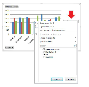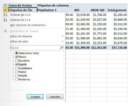 Pude filtrar y ordenar la información que se encuentra dentro de una tabla dinámica utilizando los filtros que Excel coloque de manera predeterminada en el reporte como etiquetas de columna y etiquetas de fila.