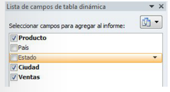 Finalmente para agregar un nuevo campo puede arrastrarlo desde la lista de campos hacia el área deseada. También puede marcar la caja de selección del campo lo cual hara que sea agregado a alguna de las áreas predeterminadas.