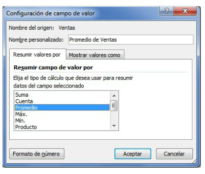 Para dar formato a los valores numéricos debe hacer clic sobre el campo correspondiente dentro del área valores.