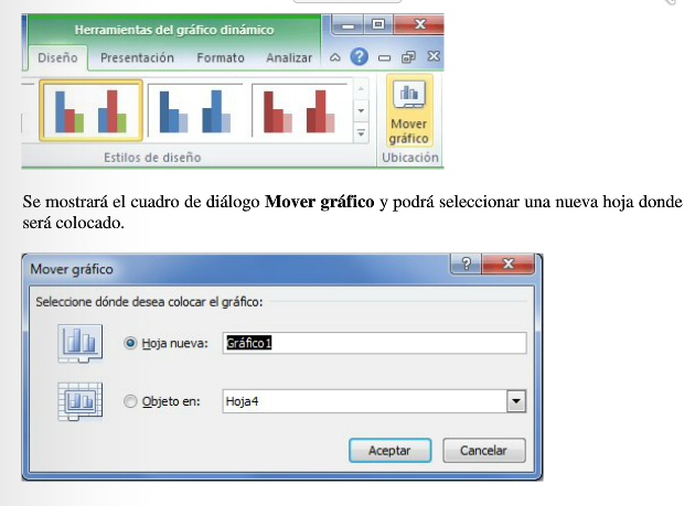 Para mover un grafico dinamico debe seleccionarlo y posteriormente seleccionar el comando Mover grafico, que se encuentra en el grupos Ubicación dentro de una lista diseño.
