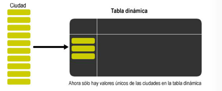 Excel tomara todos los valores de ciudades de nuestra tabla de datos y los agrupara en la “Tabla dinámica” (Eliminara los valores repetidos de la columna de datos.).