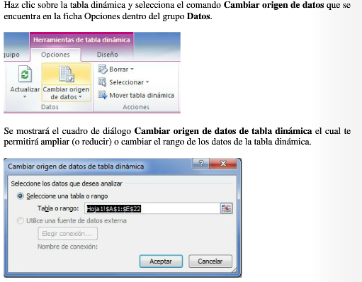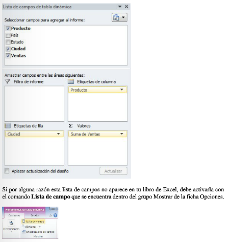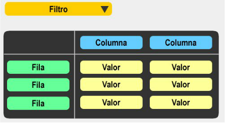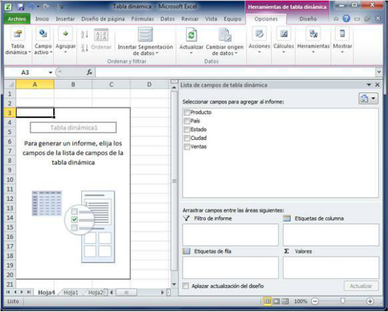 Sus partes:Cuando se ha creado una tabla dinámica, en la parte derecha de la hoja, se muestra la lista de campos disponibles y por debajo aparecen las áreas donde podemos arrastrar dichos campos. Estas áreas resaltan cada una de las partes de una tabla dinámica. Filtro de informe: Los campos que se colocan en esta área crearan filtros para la tabla dinámica a través de los cuales podemos restringir la información "Filtro de informe, Etiquetas de columna, Etiquetas de fila, Valores". Etiquetas de columna: Esta área contiene los campos que se ostrarán como columnas de la tabla dinámica. Etiquetas de fila: Contiene los campos que determinan las filas de la tabla. Valores: Son los campos que se colocarán como las "celdas" de la tabla y que serán totalizados para cada columna y fila. Una vez que especificamos los capos para cada una de las áreas, la tabla cobra vida. Podemos tener una tabla dinámica funcional con tan solo especificar las columnas, filas y valores. Los filtros solamente son una herramienta para mejorar el análisis sobre los datos de la tabla dinámica.