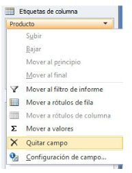 Quitar un campo:Para remover un campo arrástralo fuera del área donde se encuentra y el puntero del ratón se convierta en una "X" suelte el botón del ratón para eliminar el campo. Otra manera de eliminar un campo es haciendo clic sobre el y seleccionar la opción "Quitar campo".