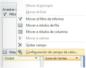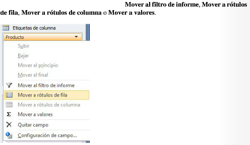 Mover un campo:Para mover un campo que ya tenemos hacia otra ubicación solamente lo arrastramos de un área a otra, o bien, seleccione cualquiera de las opciones de menú que permiten mover el campo a cualquiera de las áreas disponibles.