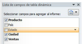 Nuevo campo:Para agregar un nuevo campo puede arrastrarlo desde la lista de campos hacia el área deseada. También pueden marcar puede marcar la caja de selección del campo lo cual hará que sea agregado a alguna de las áreas predeterminadas.