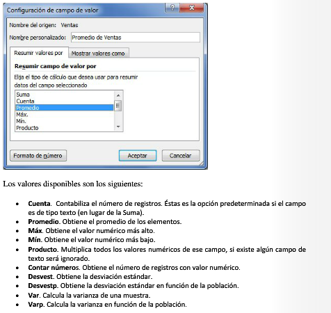 Modificar el tipo de cálculo:De forma predeterminada, Excel usa la función SUMA al momento de crear los totales y subtotales de los valores de una tabla, sin embargo, es probable que necesite utilizar alguna otra función diferente como el PROMEDIO o la CUENTA DE ELEMENTOS.Para cambiar la función debe hacer clic sobre el campo de valor y seleccionar la opción de menú "Configuración de campo de valor"