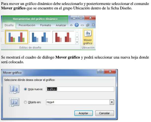 Gráfico dinámico:Es un gr´fico que está basado en los datos de una tabla dinámica y que se ajusta automáticamente al aplicar cualquier filtro sobre la información. Con este tipo de gráfico podrá ayudar a la compresión de los datos de una tabla dinámica.