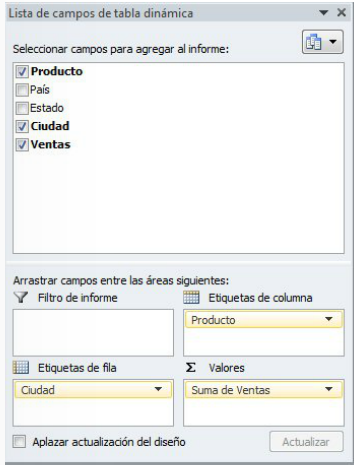 Para comletar la tabla dinámica debemos arrastrar los campos al área correspondiente.Siguiendo e ejemplos del artículo anterior, se colocará como columna el campo "Producto" y como fila al campo "ciudad".Finalmente como valores colocaré el campo "Ventas".