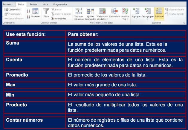 Cuadro Para cada cambio en Especificará la columna que contiene los elementos o grupos por los que desea realizar el subtotal de los valores de las demás columnas. Cuadro Usar función Se utiliza para seleccionar la función resumen, que desea utilizar para realizar el subtotal de los valores Cuadro Agregar Subtotal a Se utiliza para activar una o más casillas para especificar las columnas que contienen los valores de los que desea obtener el subtotal. Los subtotales de estas columnas se calcularan a partir de las diferencias en los elementos de la columna seleccionada en el cuadro Para cada cambio en.