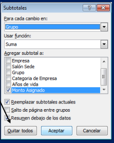 Quitar subtotalesEn el archivo que posee Subtotales: 1. Haga clic en una celda de la lista que contenga los subtotales 2. Haga clic en la ficha Datos, luego en el comando Subtotal 3. Haga clic en el botón Quitar todos 4. La tabla volverá a su estado original: