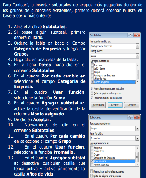 SubtotalesSubtotales es una fórmula utilizada por Microsoft Excel con la cual se puede resumir datos automáticamente calculando valores de subtotales y de totales en una lista. Para usar los subtotales automáticos, la lista debe contener columnas rotuladas y debe estar ordenada en base a las columnas para las que desee calcular los subtotales. FUNCIONES DE RESUMEN PARA LISTAS CON SUBTOTALES:
