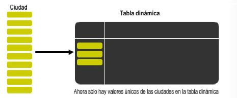 Excel va a tomar todos los valores de ciudades de nuestra tabla de datos y los colocará en nuestra nueva tabla dinamica. Es decir, eliminara las repeticiones y solo pondrá los valores unicos de la columna de datos.