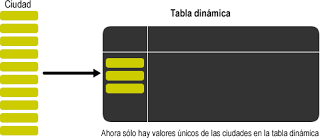 Excel tomara todos los valores de ciudades de nuestra tabla de datos y los agrupara en nuestra tabla dinámica, es decir, colocara los valores únicos de la columna de datos, eliminando las repeticiones.