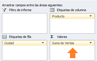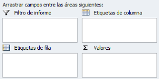 • Filtro de informe: Los campos que coloques en esta área crearán filtros para la tabla dinámica a través de los cuales podrás restringir la información que vez en pantalla. Estos filtros son adicionales a los que se pueden hacer entre las columnas y filas especificadas.• Etiquetas de columna: Esta área contiene los campos que se mostrarán como columnas de la tabla dinámica.• Etiquetas de fila: Contiene los campos que determinan las filas de la tabla dinámica.• Valores: Son los campos que se colocarán como las “celdas” de la tabla dinámica y que serán totalizados para cada columna y fila.