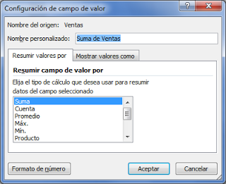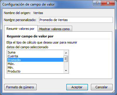 Los valores disponibles son los siguientes: Cuenta. Contabiliza el número de registros. Éstas es la opción predeterminada si el campo es de tipo texto (en lugar de la Suma). Promedio. Obtiene el promedio de los elementos. Máx. Obtiene el valor numérico más alto. Mín. Obtiene el valor numérico más bajo. Producto. Multiplica todos los valores numéricos de ese campo, si existe algún campo de texto será ignorado. Contar números. Obtiene el número de registros con valor numérico. Desvest. Obtiene la desviación estándar. Desvestp. Obtiene la desviación estándar en función de la población. Var. Calcula la varianza de una muestra. Varp. Calcula la varianza en función de la población. Al aceptar los cambios Excel aplicará de inmediato el nuevo tipo de cálculo seleccionado.