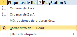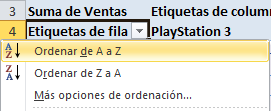 De igual manera puedes ordenar instantáneamente los valores de la tabla dinámica. Solamente haz clic sobre el botón de Etiquetas de fila o Etiquetas de columna y elige la opción Ordenar de A a Z o la opción Ordenar de Z a A.