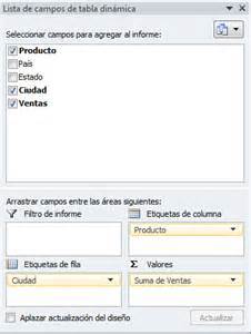 Partes de una tabla dinámica en Excel Justo cuando se ha creado una tabla dinámica se muestra en la parte derecha de la hoja la lista de campos disponibles y por debajo las áreas donde podemos arrastrar dichos campos.