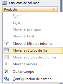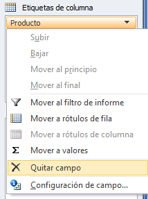 Mover un campo de una tabla dinámicaPara mover un campo ya existente hacia una nueva ubicación, solamente arrástrelo de un área a otra o de igual manera seleccione cualquiera de las opciones de menú que permiten mover el campo a cualquiera de las áreas disponibles.