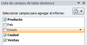 Lista de campos de una tabla dinámicaLas modificaciones las haremos en la Lista de campos de la tabla dinámica que se encuentra en la parte derecha de la pantalla. Esta lista se mostrara con tan solo hacer clic en cualquier celda de la tabla dinámica.