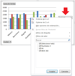 Una vez que has seleccionado el gráfico adecuado Excel lo insertará en la hoja de trabajo. Observa cómo el gráfico se modifica al momento de aplicar algún filtro sobre la tabla dinámica: