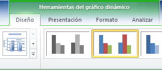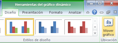 Modificar el estilo de un gráfico dinámicoYa sea que muevas el gráfico a una nueva hoja de Excel o lo dejes en su ubicación original puedes modificar su estilo con los comandos de la ficha Diseño, Presentación y Formato: