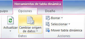 Cambiar origen de datos de una tabla dinámicaEs probable que el origen de datos de una tabla dinámica haya cambiado de ubicación y ahora tengas que considerar este cambio en tu tabla dinámica. A continuación unos pasos muy sencillos para modificar el origen de los datos.Haz clic sobre la tabla dinámica y selecciona el comando Cambiar origen de datos que se encuentra en la ficha Opciones dentro del grupo Datos.