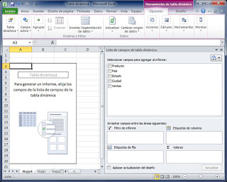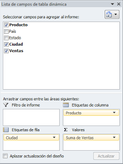 Excel agregará en la parte izquierda del libro la tabla dinámica y en la parte derecha la lista de campos. Esta lista de campos está dividida en dos secciones, primero la lista de todos los campos de los cuales podremos elegir y por debajo una zona a donde arrastraremos los campos que darán forma al reporte ya sea como columna, fila, valor o como un filtro. Para completar la tabla dinámica debemos arrastrar los campos al área correspondiente. Siguiendo el ejemplo propuesto del artículo anterior, colocaré como columna el campo Producto y como fila al campo Ciudad. Finalmente como valores colocaré el campo Ventas.