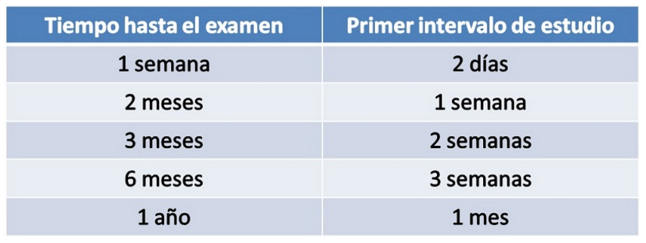 El espaciado: la ventaja de dividir el tiempo de estudio Una de las técnicas de estudio más poderosas y fáciles de usar es el argumento de frecuentes consejos maternales: “Alex, ¿no pensás que sería mejor que estudiaras un poco hoy a la tarde y otro poco mañana, en lugar de tratar de aprenderlo hoy todo de golpe?”. Este método se denomina aprendizaje distribuido o efecto de espaciado. Cuando espaciamos nuestro tiempo de estudio, aprendemos como mínimo lo mismo, y lo retenemos en la memoria por un lapso mayor que si lo condensamos en pocas horas. El aprendizaje espaciado en muchas ocasiones puede duplicar la cantidad de cosas que recordamos. Si bien el estudio nocturno intenso y reconcentrado es una estrategia que ha mejorado la nota del examen de miles de alumnos a lo largo de la historia, la fiabilidad de este esprín se parece a llenar en exceso una valija barata: durante un tiempo el contenido aguanta en su sitio, pero luego todo sale expulsado del interior. Se ha comprobado que los alumnos que lo practican llegan al segundo cuatrimestre y no recuerdan nada del primero (es como si no hubieran cursado la materia). El efecto del espaciado es especialmente útil para memorizar datos nuevos. Ya en 1897 el psicólogo Adolf Jost afirmó: “Estudiar un concepto nuevo justo después de haberlo hecho no lo afirma casi nada la memoria, estudiarlo una hora más tarde, o al día siguiente, sí lo hace”. En 1982 el investigador Piotr Wozniak se preguntó cuánto tiempo necesitaría para aprender inglés. Intentó calcular los intervalos óptimos en base a dos criterios contradictorios. Las pausas deben ser lo más largas posibles para obtener la frecuencia mínima de repeticiones y para aprovechar al máximo el efecto del espaciado. Por otro lado, deben ser lo suficientemente cortas como para garantizar que aún se recuerdan los conocimientos. Wozniak descubrió que para adquirir y retener vocabulario extranjero, definiciones científicas u otras informaciones factuales, es mejor repasar el material trascurridos uno o dos días del estudio inicial, luego una semana después y, posteriormente, un mes más tarde. Después de eso los intervalos son más largos. Si Wozniak contribuyó a establecer los intervalos mínimos necesarios para mantener accesibles los datos recién aprendidos, los Bahrick (una familia de psicólogos que se puso a estudiar francés y alemán para esta investigación) ofrecieron información sobre los intervalos máximos para el aprendizaje de por vida: el programa más espaciado y duradero fue de una vez cada dos meses durante 26 sesiones. Una buena clase debería conseguir que los contenidos se arraiguen en la memoria y el repaso espaciado durante la clase es una forma de conseguirlo. ¿Cuál es el mejor momento para repasar el material? En una investigación se pidió a 1400 personas que estudiaran 32 datos abstrusos: ¿Qué país europeo consume más comida mexicana?: Noruega. ¿En qué día de la semana zarpó Cristóbal Colón del puerto de Palos?: viernes. Cada participante estudió dos veces los datos en dos ocasiones diferentes. Si quiere descubrir la distribución óptima de su tiempo de estudio, tiene que decidir durante cuánto tiempo desea recordar algo.Los intervalos óptimos se pueden expresar en una tabla sencilla: