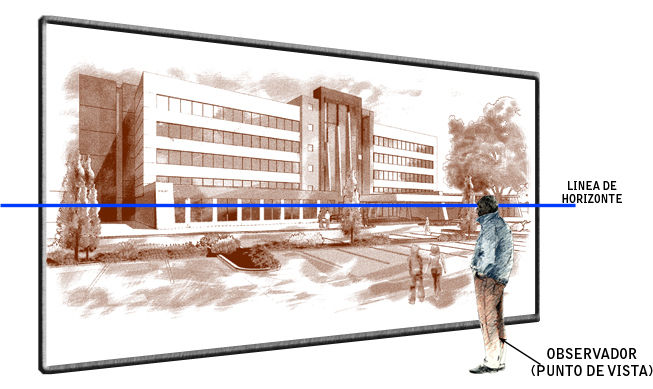 Punto de vista: Es el punto desde donde estamos mirando lo que vamos a dibujar. El punto de vista debe situarse a una distancia adecuada, desde donde podemos observar claramente nuestro objetivo. Es decir, a una distancia suficientemente alejada para abarcar todo nuestro objetivo, pero a la vez lo suficientemente cerca para captar detalles.