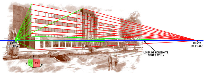 Puntos de fuga definidos En una proyección dada, se pueden determinar de uno a tres puntos de fuga para representar las tres direcciones ortogonales correspondientes a los tres ejes espaciales XYZ, según se mantengan paralelas al plano de proyección o se intersequen con él. Estos tres ejes se pueden imaginar como las aristas de un ortoedro o un cubo.En función de las direcciones de los ejes ortogonales respecto al plano de proyección, las perspectivas se denominan: Perspectiva frontal: Con un solo punto de fuga sobre el dibujo. Ocurre cuando una de las caras del cubo es paralela al plano de proyección, por tanto dos ejes del espacio son paralelos al plano de proyección. Las proyecciones de las rectas en esas direcciones se verán realmente paralelas en el dibujo. Perspectiva oblicua: Con dos puntos de fuga. Ocurre cuando el cubo está parcialmente ladeado, y solo un eje espacial es paralelo al plano de proyección. Las rectas con esa dirección se proyectan realmente paralelas en el dibujo. Perspectiva aérea: Con tres puntos de fuga. Ocurre cuando el cubo está parcialmente ladeado y volcado. Ninguna dirección ortogonal es paralela al plano de proyección. En el sistema de proyección cónica, las proyecciones de las rectas horizontales convergen siempre en la línea del horizonte; y solamente las proyecciones de las rectas paralelas al plano del cuadro no poseen un punto de fuga definido, pues también se proyectan realmente paralelas en el dibujo.