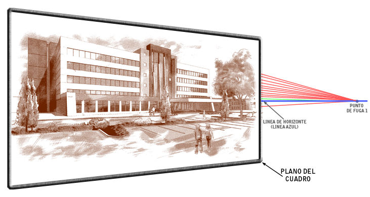 Plano del cuadro: Este es el área que define los limites de nuestro dibujo. Es decir, como si fuera una especie de marco en donde encuadramos nuestro dibujo. Por lo general, los puntos de fuga quedan por fuera de nuestro plano de encuadre.