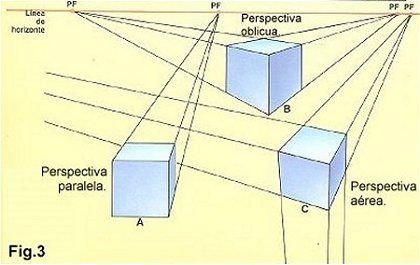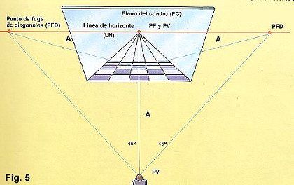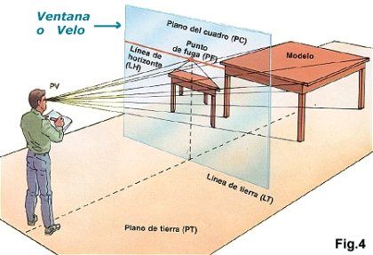 La línea del horizonte (En los dibujos nos referiremos a ella con las siglas LH), por lo que la Línea del horizonte es una línea imaginaria que, mirando al frente, se halla situada a la altura de nuestros ojos. El ejemplo típico que se emplea para ilustrar la línea del horizonte es un día en la playa. La línea del horizonte coincide con la línea que delimita el cielo y el agua. Si estamos tumbados en la playa vemos poco mar, la línea del horizonte está baja, si nos ponemos de pie, vemos más superficie de agua, con nosotros ha subido la línea del horizonte, y mucho más si nos asomamos a los acantilados, la línea del horizonte habrá subido con nosotros y estará muchísimo más alta. Por lo tanto antes de empezar a dibujar, a pintar tenemos que determinar donde se encuentra la línea del horizonte, encima o debajo del tema que queremos representar, incluso puede ser que se halle situada fuera del cuadro.El punto o puntos de fuga. (En los dibujos nos referiremos a ella con las siglas PF) Los puntos de fuga se hallan siempre situados en la línea del horizonte. Si observamos la Fig. 2, que representa los andenes de una estación de tren, veremos que todas las líneas paralelas perpendiculares al horizonte confluyen en un punto que es al que denominamos punto de fuga. En un dibujo se pueden emplear uno o más puntos de fuga, según como sea la perspectiva: perspectiva paralela, (a la que algunos llaman frontal) con un solo punto de fuga, perspectiva oblicua con dos puntos de fuga y perspectiva aérea con tres puntos de fuga. (Ver Fig.3). Si observamos la figura 3, notaremos que en la perspectiva aérea nos quedan dos puntos de fuga fuera del plano del cuadro.Plano del Cuadro. (En los dibujos nos referiremos a ella con las siglas PC) Es la superficie física del elemento sobre el cual vas a dibujar o pintar, que no es más que el papel o lienzo sobre el que plasmamos el dibujo. Lo que Leonardo da Vinci llamo la ventana y León Batista Alberti (arquitecto S. XV) llamo el velo. (Ver Fig. 4).Punto de vista. (En los dibujos nos referiremos a ella con las siglas PV) Es el punto desde donde miramos. Se halla situado en el mismo plano que la línea del horizonte y a la misma altura que el punto de fuga. (Ver Fig. 4).Línea de Tierra. (En los dibujos nos referiremos a ella con las siglas LT). Que es la línea imaginaria donde se apoya el modelo a reproducir. Por lo que la distancia entre la línea de tierra y el punto de fuga será igual a la que existe entre el suelo (Plano de Tierra) sobre el que estamos y nuestros ojos. (Ver Fig. 4).Plano de Tierra. (En los dibujos nos referiremos a ella con las siglas PT) El plano de tierra es la superficie sobre la que nos asentamos tanto nosotros como el modelo objeto de nuestra observación. (Ver fig. 4).Punto de fuga de diagonales.(En los dibujos nos referiremos a este término con las siglas PFD).Este es un punto de fuga adicional que se emplea para representar espacios y formas iguales que fugan al horizonte, como por ejemplo los palos de un tendido eléctrico, las columnas de un claustro, las baldosas de una sala.http://www.todacultura.com/talleres/taller_dibujo/fundamentos.htm