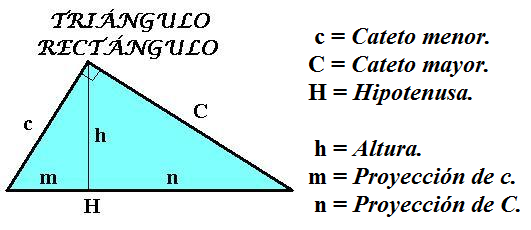 Teorema del Cateto: \(C^2 = H · n\) \(c^2 = H · m\) EJERCICIOS:\(H=7 , n=5 , C = ?\) \(C^2 = 7 · 5\) \(C = \sqrt {35}\) = 5'92\(H=7 , m=H-n=7-5 = 2 , c = ? \) \(c^2 = 7 · 2 \)\(c = \sqrt {14}\) = 3'74
