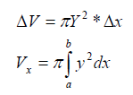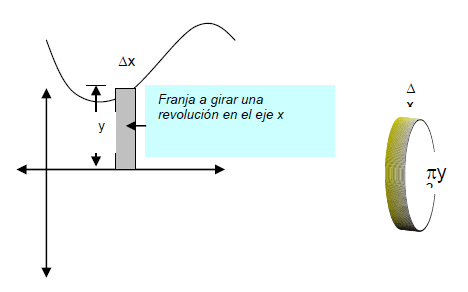 Un sólido de revolución es un cuerpo que puede obtenerse mediante una operación geométrica de rotación de una superficie plana alrededor de una recta que se contenida en su mismo plano. En principio, cualquier cuerpo con simetría axial o cilíndricas es un sólido de revolución.Se denomina sólido de revolución o volumen de revolución, al sólido obtenido al rotar una región del plano alrededor de una recta ubicada en el mismo, las cuales pueden o no cruzarse. Dicha recta se denomina eje de revolución.Sea f una función continua y positiva en el intervalo [a,b]. Si la región R indicada en la figura rota alrededor del eje X, ésta genera un sólido de revolución cuyo volumen tratamos de determinar.Al hacer girar dicha longitud de una curva alrededor de un eje, siempre engendra una circunferencia y por ende crea un volumen de revolución, este volumen es calculable aplicando el siguiente análisis: 1. Girando la franja indicada alrededor del eje x, manteniendo la base de la franja fija en el eje de giro, se crea un volumen en forma de una moneda, de donde se deduce que el volumen es igual al área del círculo multiplicado por el espesor.