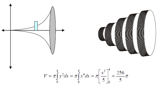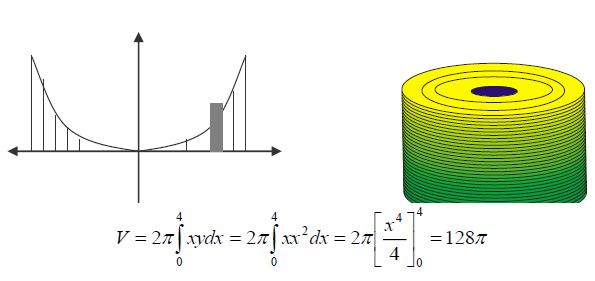Ejemplo : Calcular el volumen que se engendra al girar el área limitada por x=0, x=4, lafunción y=x^2 , ubicada en el primer cuadrante: a) alrededor del eje x, b) alrededor del eje y.a) alrededor del eje x