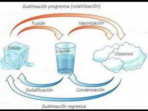 Cambios de estado La materia puede cambiarse de un estado a otro. De sólido a líquido es fusión, de líquido a gaseoso es vaporización, de gaseoso a sólido es sublimación regresiva, de gaseoso a líquido es condensación, de líquido a sólido es solidificación y de sólido a gaseoso es sublimación progresiva.