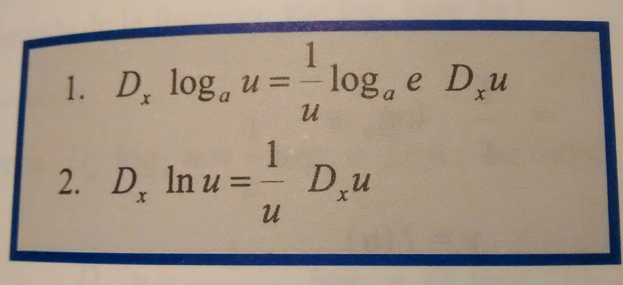 Derivada de las funciones logarítmicas:Para calcular la derivada de una función logarítmica se aplican los siguientes teoremas.Considerando que U es una función continua de x, esto es u= f(u)